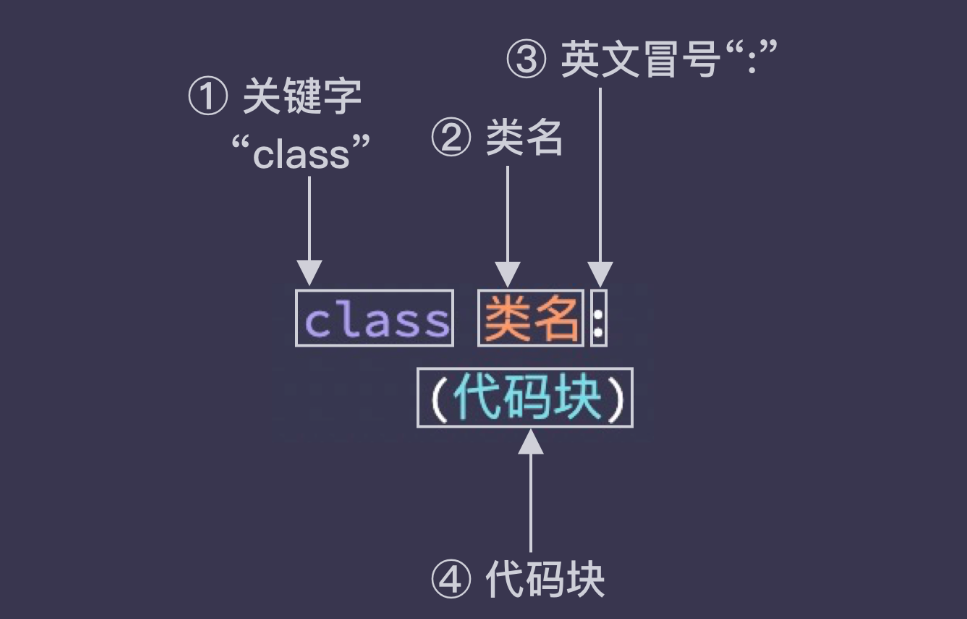 ① 关键字"class";② 类名;③ 英文冒号":";④ 代码块(即类里面的代码内容)。