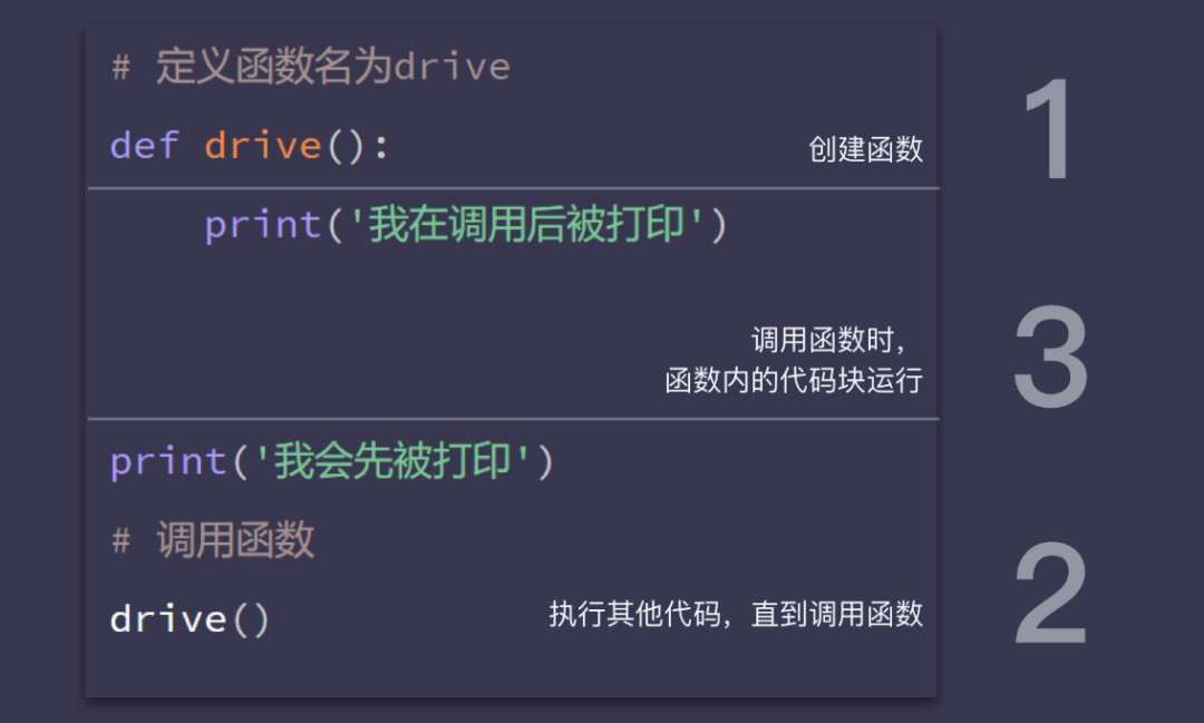 drive()# 代码会报错# 定义函数名为drivedef drive():print('一辆黑色的汽车向前开')