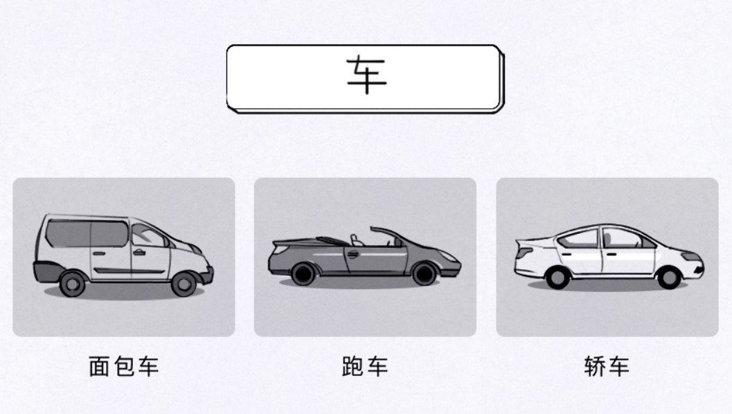 虽然每辆车都有各自不同的地方,如颜色不同、大小不同等,但它们的一些共同特征(例如:有轮子,能跑等)决定了它们都属于车这一类。