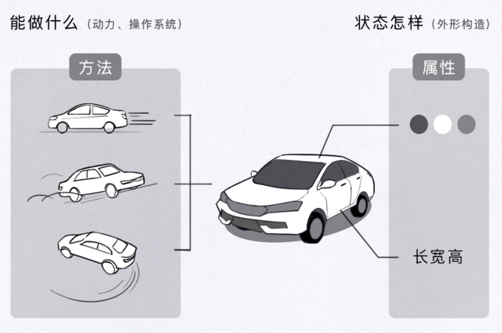 每个函数会实现特定的功能,将一个个函数组合在一起,就实现了这个类它能做的所有事情。类比到汽车中,一个函数就像一个汽车零部件,它会负责实现它所对应的功能,如:前进、刹车、漂移等功能。