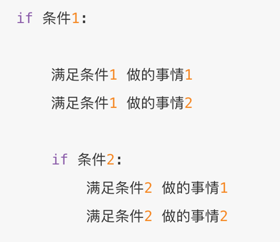 age = 18``if age >= 18:` `print("我已经成年了")` `print("即将步入大学生活")`` ``print("时间过得真快呀") #此句不属于if语句,无论if条件是否成立,此句都会正常输出`` ``我已经成年了``即将步入大学生活``时间过得真快呀