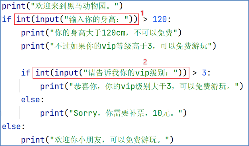 print("欢迎来到黑马动物园。")``heigh = int(input("请输入您的身高(cm):"))``if heigh >= 120:` `print("您的身高超出120cm,游玩需要购票10元。")``else:` `print("您的身高未超出120cm,可以免费游玩。")`` ``print("祝您游玩愉快。")`` ``欢迎来到黑马动物园。``请输入您的身高(cm):190``您的身高超出120cm,游玩需要购票10元。``祝您游玩愉快。`` ``欢迎来到黑马动物园。``请输入您的身高(cm):110``您的身高未超出120cm,可以免费游玩。``祝您游玩愉快。