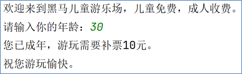 print("欢迎来到黑马儿童游乐场,儿童免费,成人收费。")``age = int(input("请输入您的年龄:"))``if age >= 18:` `print("您已成年,游玩需要补票10元")``else:` `print("您还未成年,可免费游玩。")`` ``print("祝您游玩愉快。")`` ``欢迎来到黑马儿童游乐场,儿童免费,成人收费。``请输入您的年龄:14``您还未成年,可免费游玩。``祝您游玩愉快。
