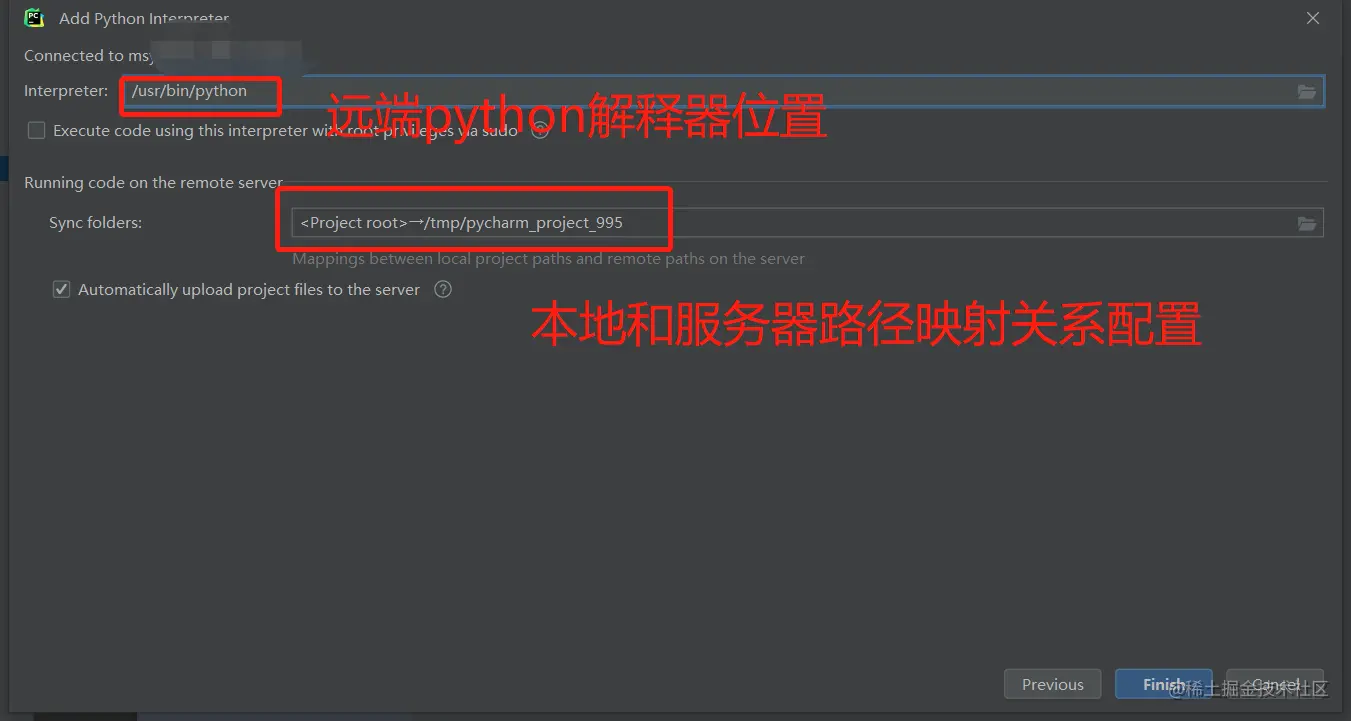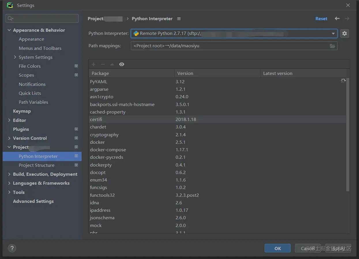 - 配置远端解释器路径,以及本地和远端代码目录的映射关系