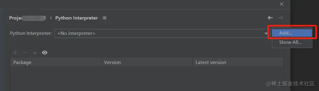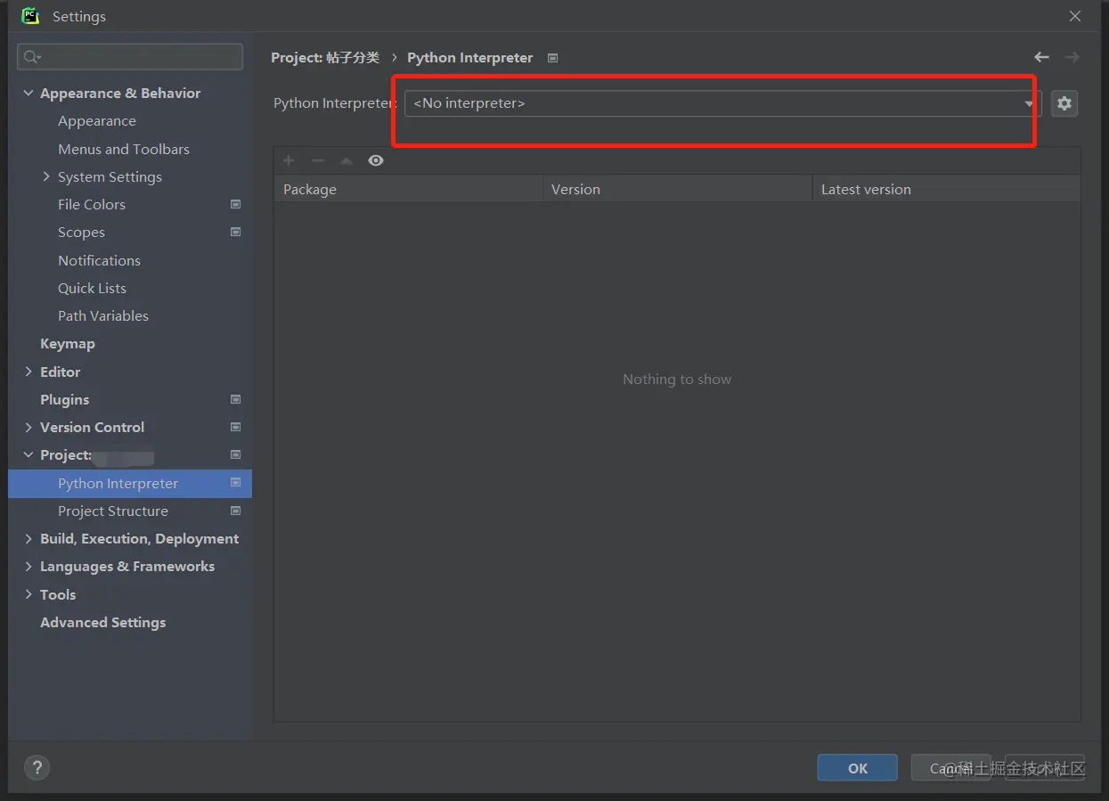 File → Settings → Project:当前项目名称 →Python Interpreter- 显然解释器是空的,需要配置解释器,右上角add添加