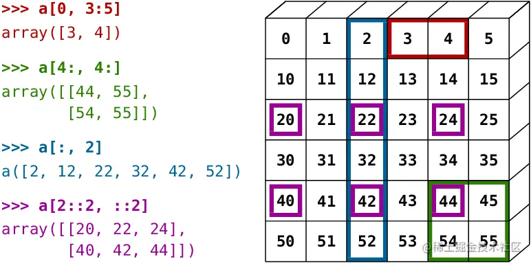 首先是NumPy的数组切片非常强大,如图: