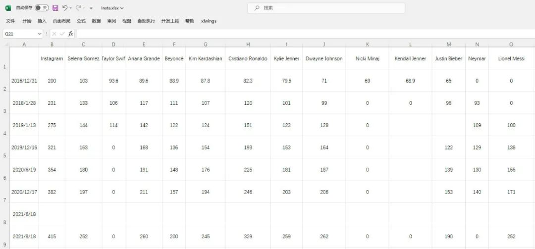 其中第一列中包含日期,随后的每个列标题都是数据类别,下面包含每个日期的值。