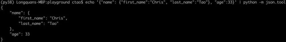 echo '{"name": {"first_name":"Chris", "last_name":"Tao"}, "age":33}' | python -m json.tool