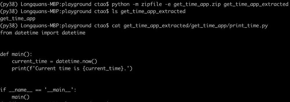 如果我们想要创建一个简单的应用,比如前面写的获取当前时间的应用程序,我们不必再需要像 PyInstaller 这样的第三方工具包,Python 内置的 Zipapp 就可以做到。假设我们要打包成一个"Get Time"的应用,我们可以在命令行运行下面的命令。