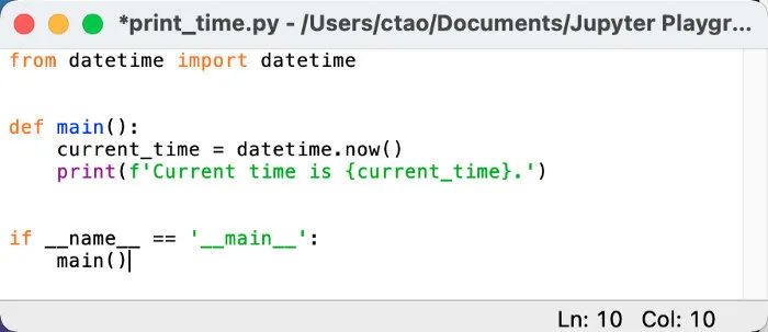 如果文件目录不存在,idlelib将无法创建,因此如果必要,我们需要创建一个。我们运行完这个命令之后,print_time.py 只有执行保存的情况下才会创建到本地。现在应该会弹出编辑器,我们可以在里面写一些代码, 可以看到代码是支持语法高亮的。