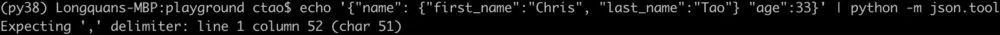 echo '{"name": {"first_name":"Chris", "last_name":"Tao"} "age":33}' | python -m json.tool