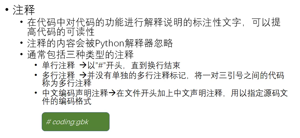 - Python 解释器在执行代码时会忽略注释,不做任何处理。
