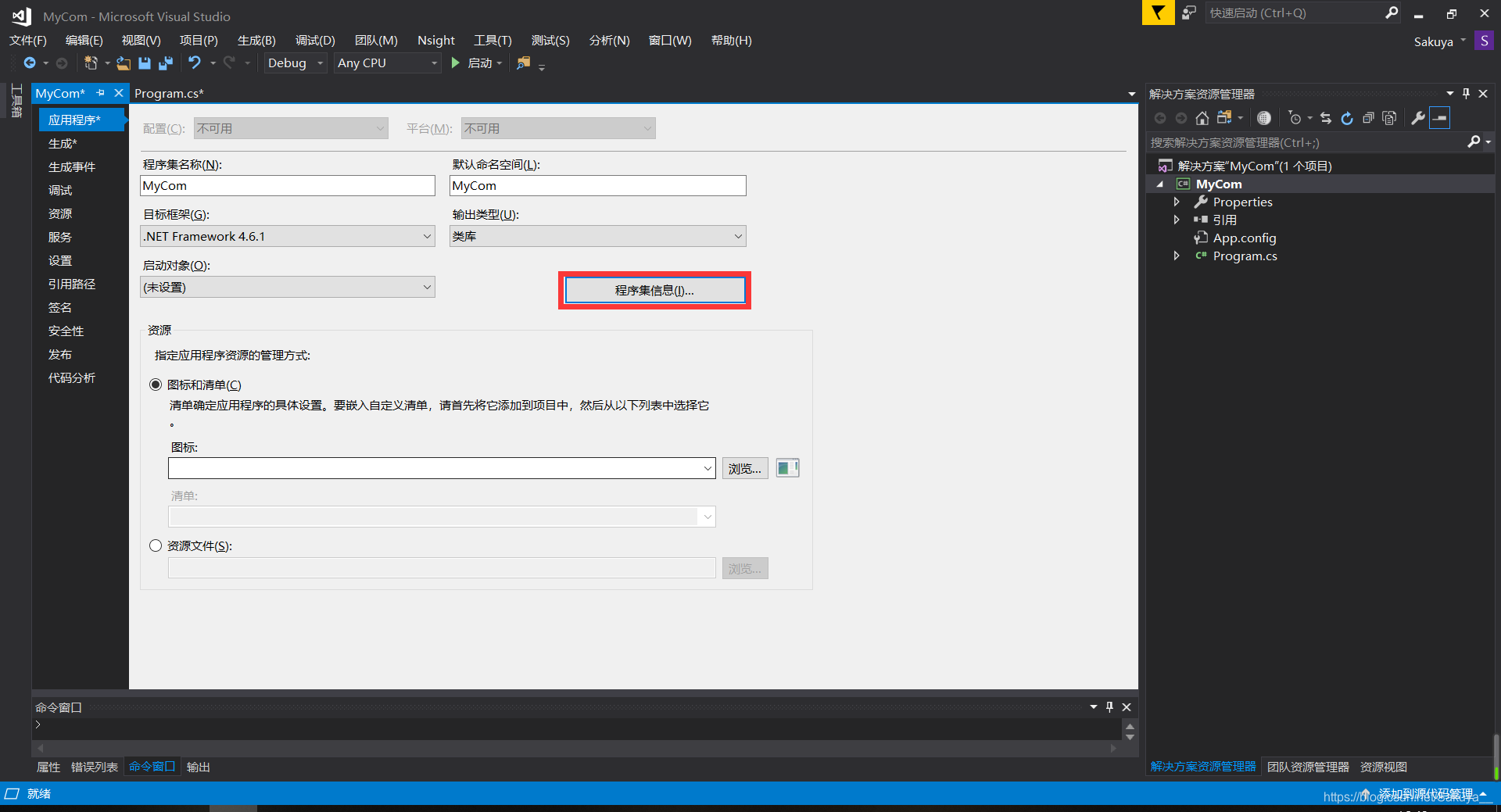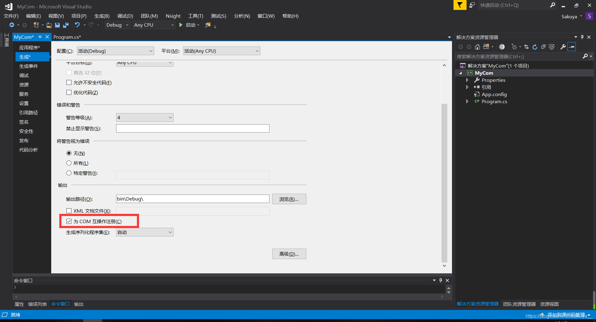 设置完后再生成解决方案,就会在MyCom\bin\Debug目录下找到MyCom.dll和MyCom.tlb文件了。如果出现无法注册程序集的错误,就以管理员身份启动Visual Stdio就可以了。