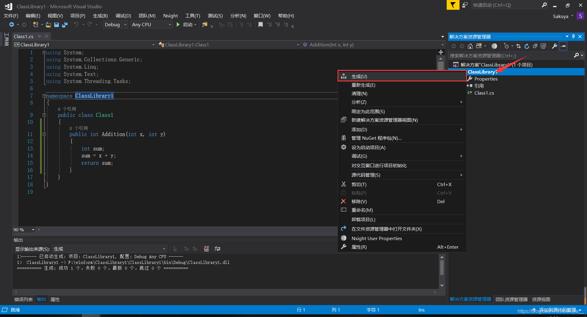 3. 生成dll,右键单击解决方案中的名称→【生成】,就会在刚才创建的项目路径下的bin目录下的Debug文件夹中生成了该类库的dll文件。然后我们就可以将这个dll文件拷贝到其他项目中供其他项目引用,调用其中相应的方法了: