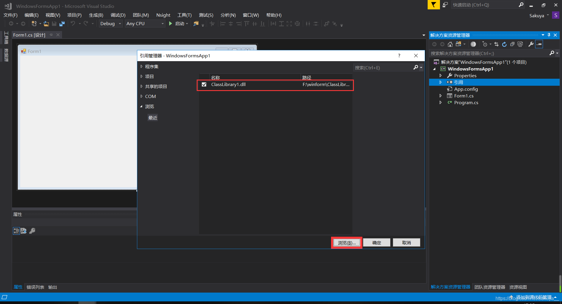 在一个窗体应用程序中右键单击引用→【添加引用】→【浏览】→选择刚才生成的dll的路径,点击确定,就把dll导入到项目中了。