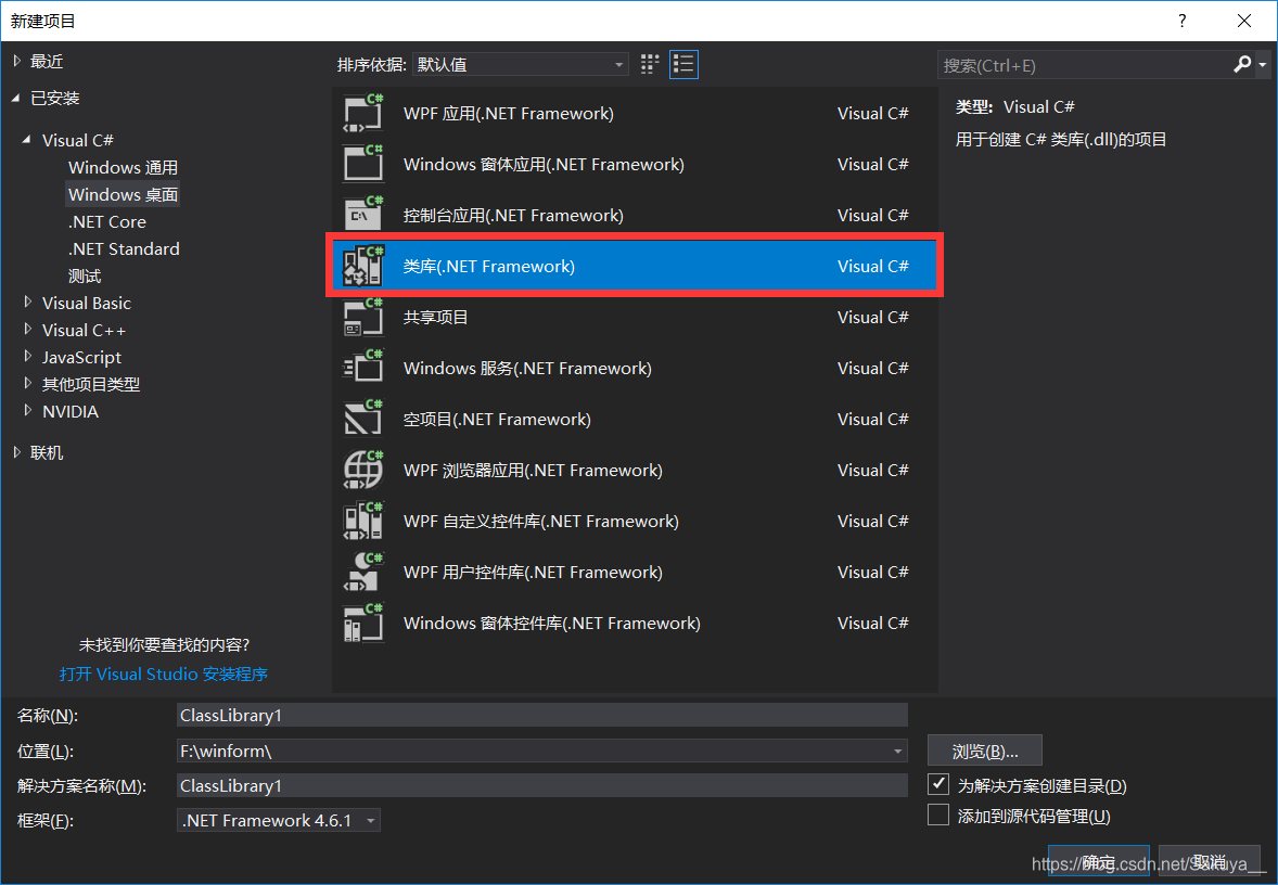 1. 在Visual Studio中新建类库项目,点击【文件】→【新建】→【Visual C#】→【类库】: