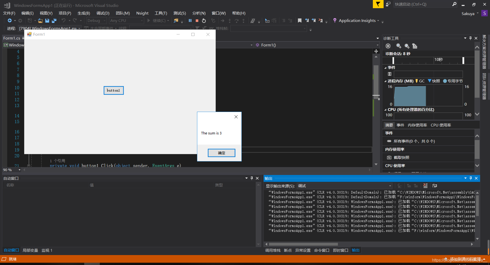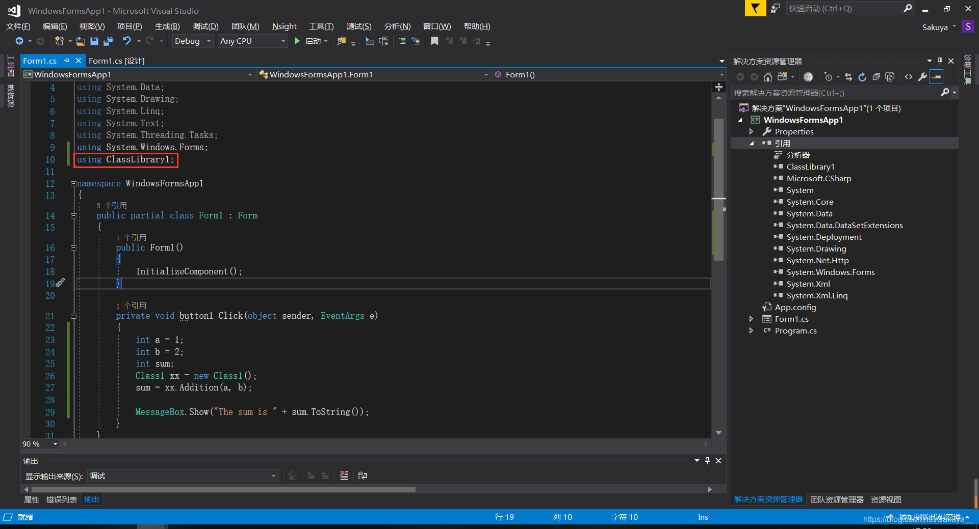 之后新建一个按钮组件,双击编写代码,使用"using + dll中同样的命名空间"来引用这个dll,使用dll中的方法就先创建对象,然后用对象调用该方法。