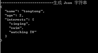 //生成 Json 字符串 Console.WriteLine("=========================生成 Json 字符串"); JObject jObj2 = new JObject(); string name = "tongtong"; int age = 2; JArray interests = new JArray("singing", "swim", "watching TV"); jObj2.Add("name", name); jObj2.Add("age", age); jObj2.Add("interests", interests); Console.WriteLine(jObj2.ToString(Formatting.Indented));