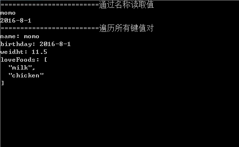 static void Main(string[] args) { string jStr = "{name: 'momo', birthday: '2016-8-1', weidht: 11.5, loveFoods: ['milk', 'chicken']}"; //Json 字符串 JObject jObj = null; try { jObj = JObject.Parse(jStr); //将 Json 字符串转换成 JObject 类型,如果 Json 字符串不合法,会异常。 } catch (Exception ex) { Console.WriteLine(ex.Message); return; } //通过名称读取值 Console.WriteLine("=========================通过名称读取值"); Console.WriteLine(jObj["name"]); Console.WriteLine(jObj.GetValue("birthday")); //遍历所有键值对 Console.WriteLine("=========================遍历所有键值对"); foreach (var item in jObj) { Console.WriteLine(item.Key.ToString() + ": " + item.Value.ToString()); } Console.ReadLine(); }