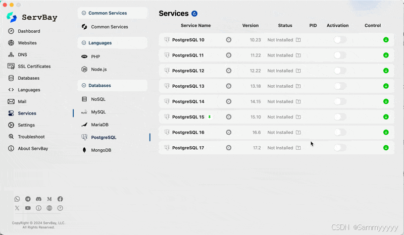 其实并没有这么麻烦,我使用的开发环境叫ServBay,不到30s,就能把SQL和NoSQL数据库都装一遍。