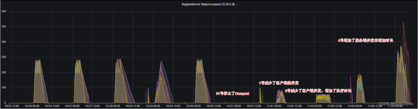 下面是之前调试的几种策略的 MajorCompact 队列图,可以看到停止 Compact 任务、 减少 Compact 并发、减少 Compact 并发但是增加执行时长这几种策略都有 Compact 执行不完的风险。增加服务端的 Compact 线程数可以明显加大 Compact 的执行力度。