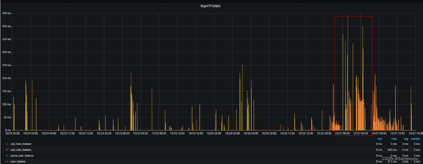 10月27号,用户反馈 g_feature 资源组的回溯任务在夜间的耗时比较大。在00:49——04:16期间,查询的平均耗时是大于100ms的。