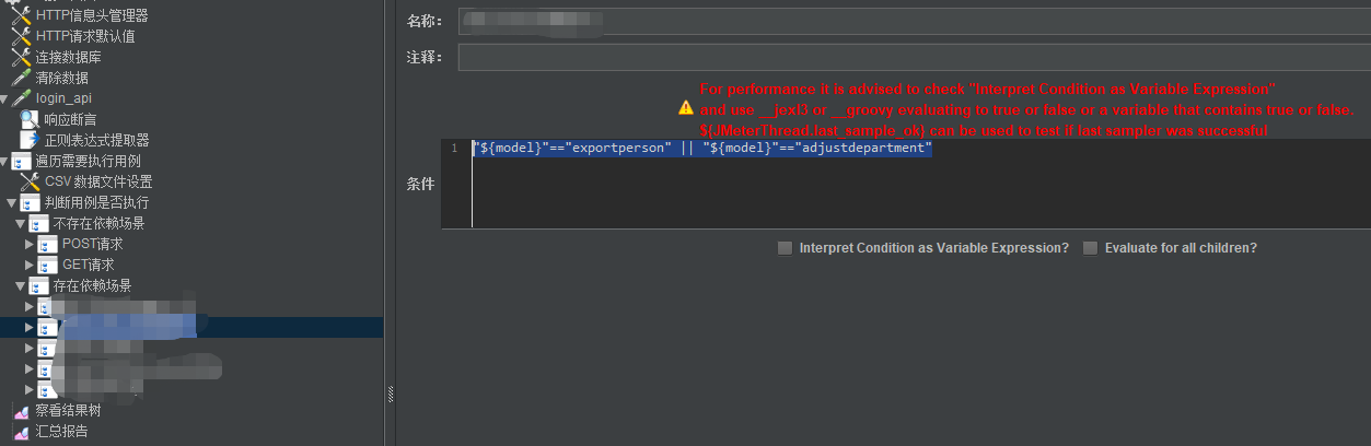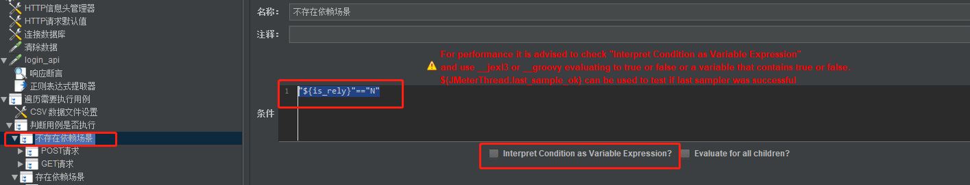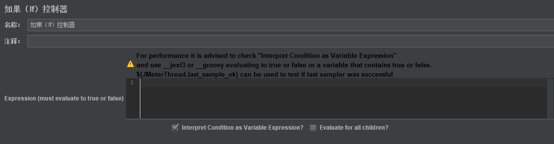 Interpret Condition as Variable Expression?:默认勾选,当勾选时将条件解释为变量表达式,此时必须使用__jexl3 or __groovy 表达式;去掉勾选时,此处可直接填写条件表达式。黄色三角处的提示说明了默认勾选的优势。