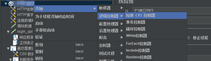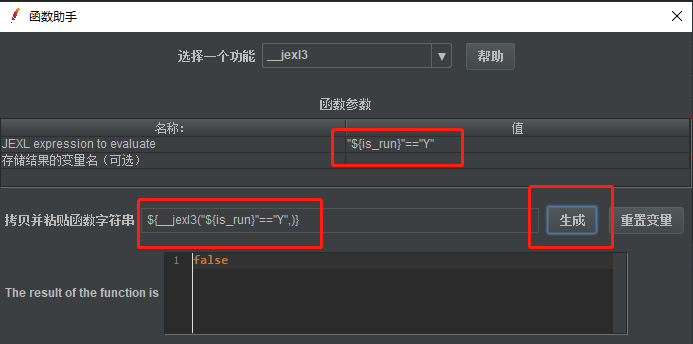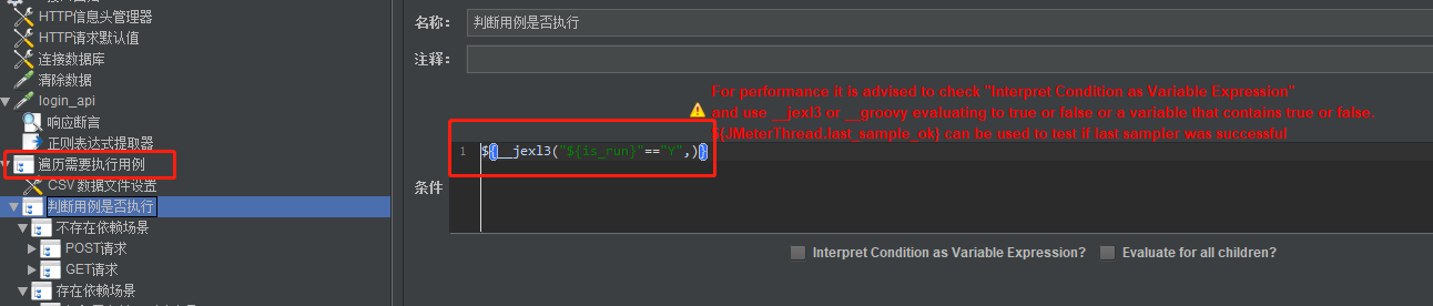 当用例运行标志为Y时,则执行,否则不执行,条件表达式为${__jexl3("${is_run}"=="Y",)}