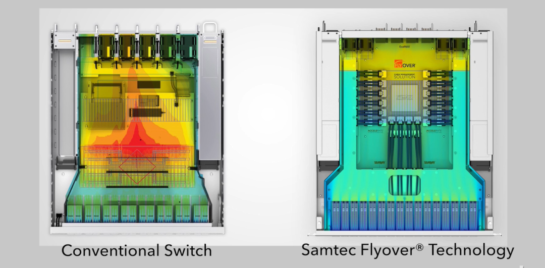 Samtec Flyover®电缆系统允许ASIC、FPGA或设备位于托盘的中心,在系统中创造更多的对称性,并导致更多的层状气流。 这使我们有更低的ASIC进口温度。