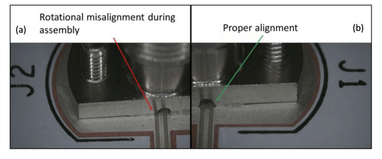 即使在装配连接器的过程中很小心,当螺丝被拧紧到最终位置时,连接器上的力会导致它们旋转。下面的图片提供了一个例子,如图所示:(a)和(b)均为1.35 mm, 90 GHz连接器。虽然视觉上被放大以清楚地显示错位,但在装配过程中识别错位是非常困难的。通常直到性能下降,需要进一步检查时,这种情况才会显现出来。即使错位变得很明显,在电路板组装过程中纠正精确对准仍然是非常困难的。错位到"(a) "中所示的顺序将导致发射时的电容性负载。连接器的接地体离表面布线太近。