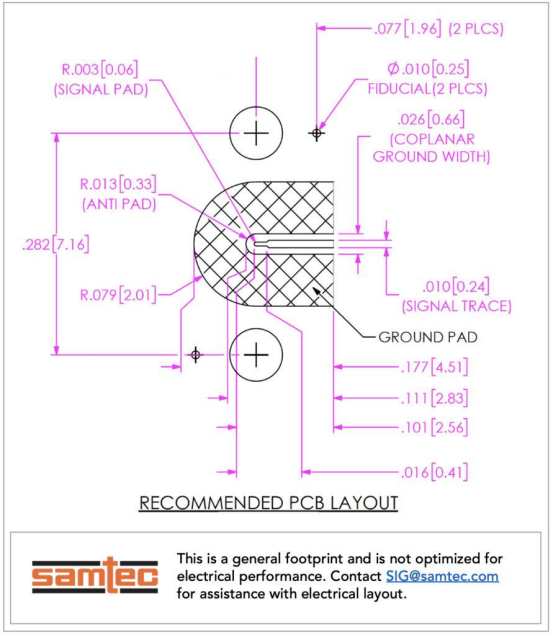 下面显示了1.35毫米微带连接器的规格,其对准槽与上述推荐的PCB布局相吻合: