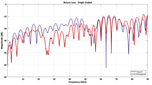 在频域中检查相同的1.35毫米连接器时,我们看到更好的对准导致在大频率范围内改善回波损耗: