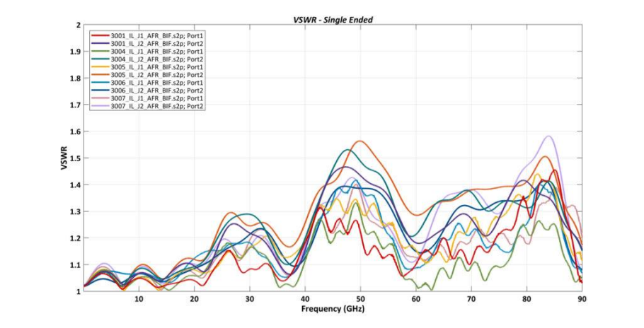 当看下面的VSWR图时,一个完美对齐的1.35毫米连接器的VSWR图,该连接器是使用视觉对齐过程(例如将对准槽与PCB上的靶标相匹配)组装的,我们看到出色的性能结果;特别是在50GHz到80GHz之间。在连接器的截止频率处,VSWR甚至低于1.2:1。为了彻底了解性能特点,我们取了十个样品。