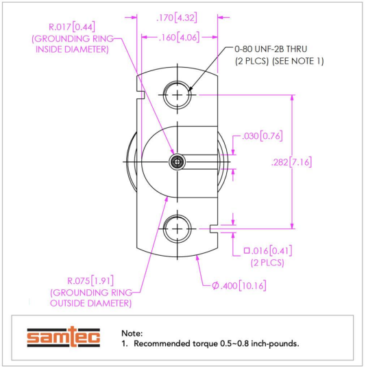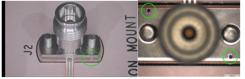 由于凹槽与PCB上的靶标对齐,安装孔位置和焊盘位置之间的任何偏移都很容易被注意到;因此,消除了对影响后续性能测量的装配效果的任何怀疑。凹槽与靶标对齐,可确保连接器的中心针在PCB焊盘上的中心位置。这种技术可用于微带/CPWG和带状线连接器。