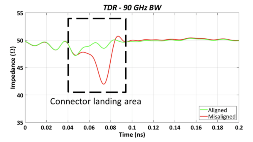 下面的TDR图表说明,当测量上面提到的同一个1.35毫米的连接器时,当发生上图所示的错位量时,会引入一个大约8欧姆的电容性下降。当使用非常宽的带宽时,即使是很小的错位也会对结果的性能产生很大影响。此外,在性能分析、故障排除和纠正措施方面所损失的时间可能是极其昂贵的。