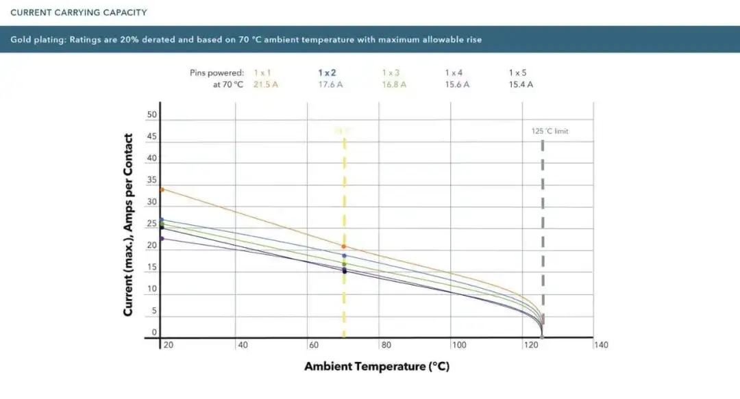 我们先来看看mPower®连接器的载流能力——这款2mm紧凑间距的连接器可以实现最高18A/触点的载流能力,这使其适用于很多大功率的应用。而且从图2中我们可以看出,mPower®连接器系列不同配置的产品在很宽的温度范围内,载流能力都不俗。