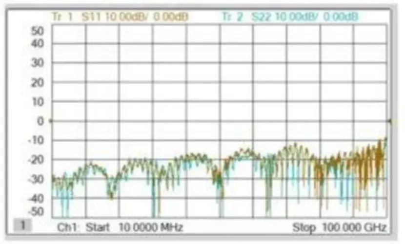 可以看到,性能十分卓越。端口 1 和端口2 的回波损耗(RL)在70 GHz以下优于15 dB,在100 GHz以下优于10 dB。