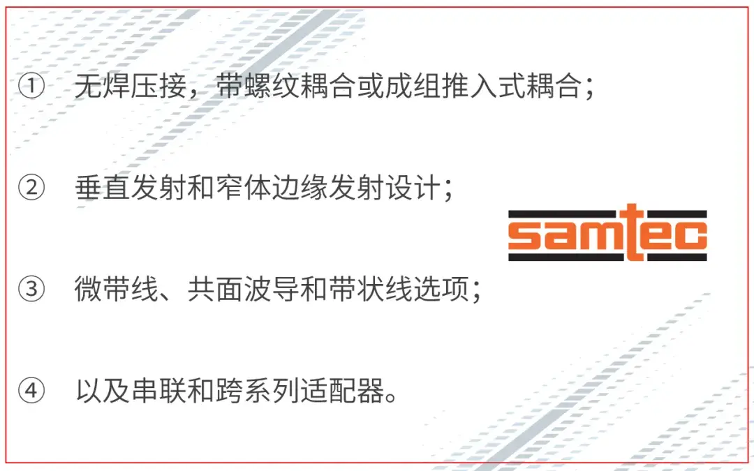 Samtec还提供从DC to 110 GHz的各种支持测试和测量的互连器件,可选项包括: