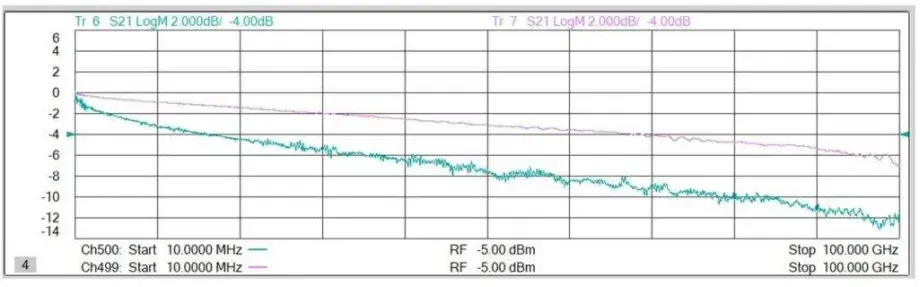 接下来,我们看到两条插入损耗曲线。蓝色轨迹是不去嵌 PCB 时的损耗。紫色轨迹是 BE90A 的单独损耗。带有PCB过渡的BE90A在90 GHz时的损耗略高于5 dB。