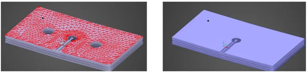 图 6:左图突出显示了所有小的“刻面”段,这些段表示为独立的片状对象;右图展示了“清理”后的模型,其中小段已全部转化为平滑的实体模型。