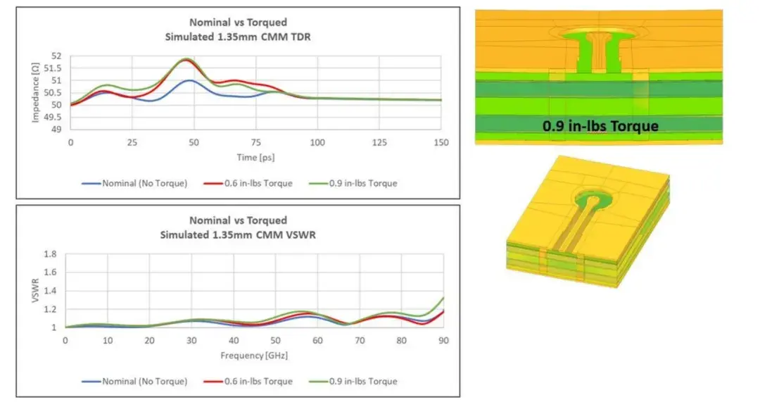 第三个模型(见图 10)施加了 0.9 英寸-磅的扭矩,略高于Samtec规定的扭矩范围。与0.6 英寸-磅扭矩模型相比,阻抗显示出一些微小的偏差。在接近 90 GHz 之前,所得到的VSWR 与前两个模型显示出类似的相关性。所有这三种情况在整个带宽范围内的 VSWR 均优于 1.4:1。