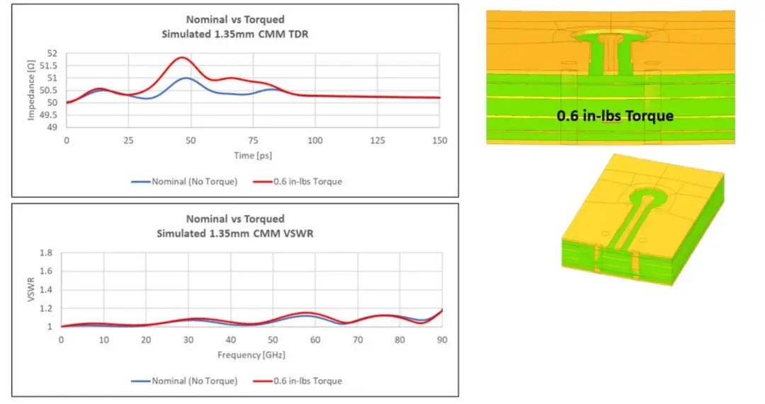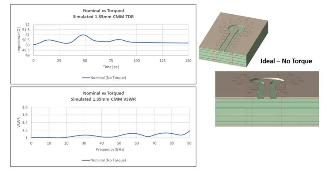图 8:当针脚和焊盘对齐且没有扭矩时,VSWR 处于最佳状态,阻抗为标称值。