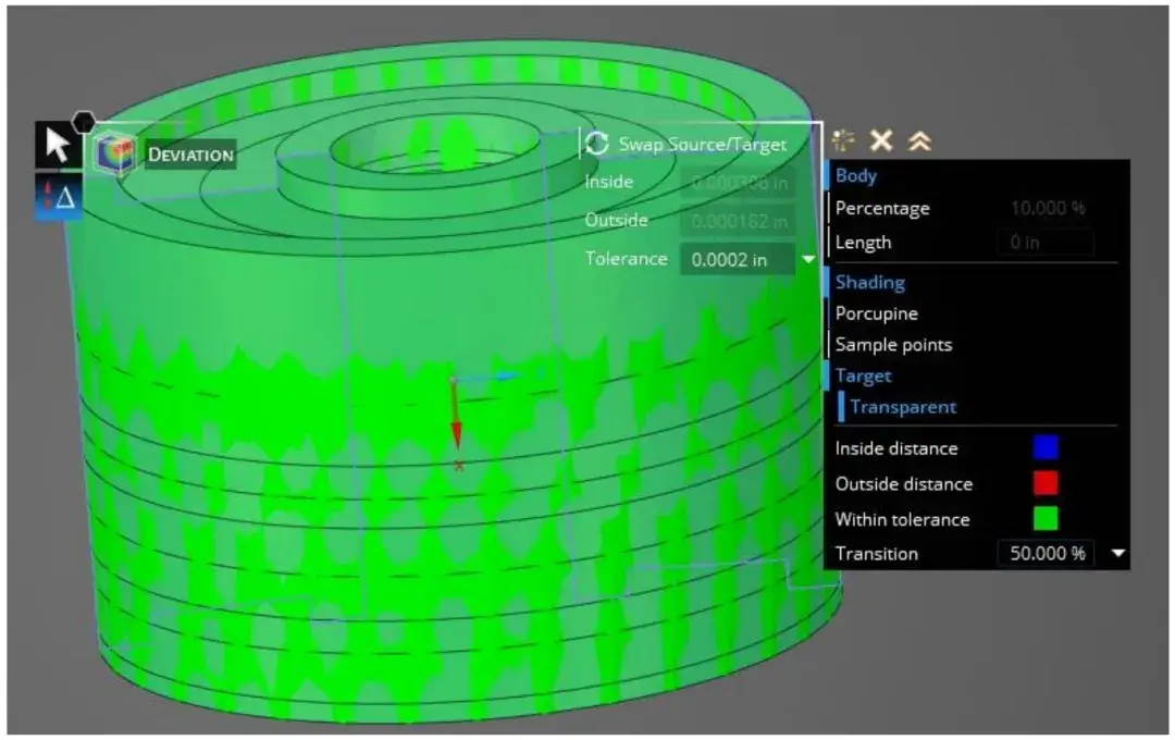 为了验证清理后的实体几何形状是否是原始刻面几何形状的合理精确表示,我们使用Ansys Discovery 中的偏差工具快速比较几何形状,并进行颜色叠加。我们将介电体设置为 2/10,000 英寸的公差,将迹线设置为 1/10,000 英寸的公差。图 7 显示了颜色匹配(绿色表示在公差范围内),确认了清理后的几何形状实际上是从 Ansys Mechanical 导出的原始模型的准确表示。