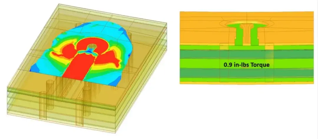 一旦可靠的模型被创建,下一步就是确定机械变形几何对电气性能的影响。为了收集基线特性,我们检查了一个理想的 PCB 模型的性能,该模型没有扭矩、没有模拟的针脚压缩,也没有 PCB 变形(见图 8)