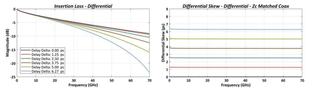 和未耦合的同轴电缆相比,双同轴电缆(其绝缘导体被包裹在屏蔽层内)会产生非常高的线对内耦合系数。这个耦合系数会随着频率的升高而增大,从而在频率升高时,限制由延迟skew导致的信号损耗。此外,高耦合系数对导体和屏蔽层之间几何形状的对称性提出了更高的要求。任何不对称的情况都会表现为与频率相关的skew,而且在较低频率时,这种skew往往会更明显。