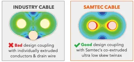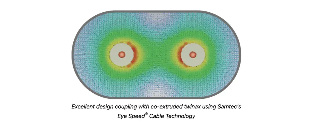 并不是所有的双同轴电缆构造都一样,所以动态移动、温度、skew或者延迟对信号的影响不能一概而论。例如,Samtec的Eye Speed®电缆技术采用了先进的共挤工艺,将导体在同一电介质中一起挤出,这样就几乎不存在相位延迟不匹配的问题,同时在导体和屏蔽层之间实现了行业领先的对称性。