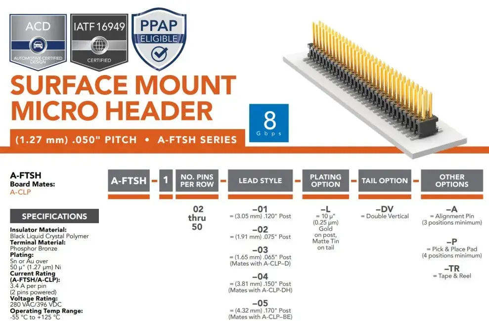 生产件批准程序是一项汽车质量标准,其提交流程相当复杂,旨在验证零部件的生产过程。在 Samtec,我们在零件编号前加上 “A-” 来标识符合生产件批准程序的零件。
