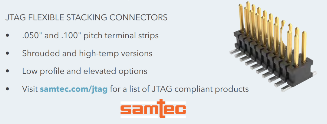 例如,对于诸如车窗开关或转向柱内的电子设备等应用,可以将带有防护外壳、经过极化处理的连接器组合在一起,并控制其堆叠高度。一些Samtec的客户使用Flex Stack连接器来测试和调试这些高可靠性系统,比如Samtec的JTAG柔性堆叠连接器,在生产过程中,这些连接器稍后可从电路板上拆卸下来