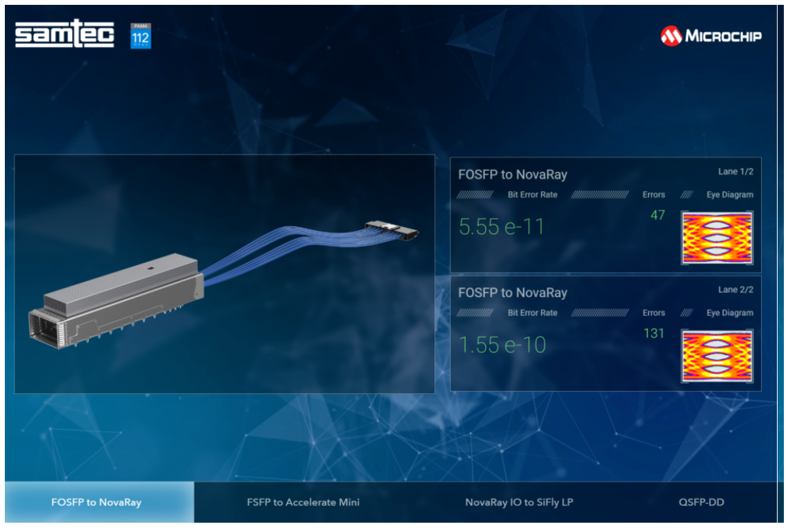 整套系统展示了我们的前面板连接器系统,包含了一个NovaRay I/O、一个Flyover® OSFP,一个Flyover® SFP,并与一个传统采用Flyover QSFP-DD相比较,该方案使信号从PHY芯片直传至near-chip连接器,相较传统QSFP-DD连接方式,显著缩短了PCB走线长度。