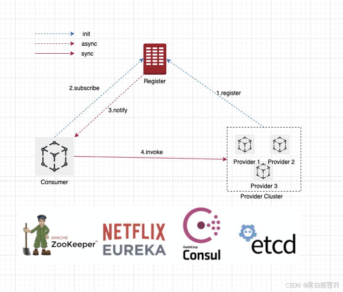 2、推送的方式:服务订阅/通知变更(下发):服务消费方(Consumer)主动向注册中心订阅某个服务,当注册中心中该服务信息发生变更时,注册中心主动通知消费者。